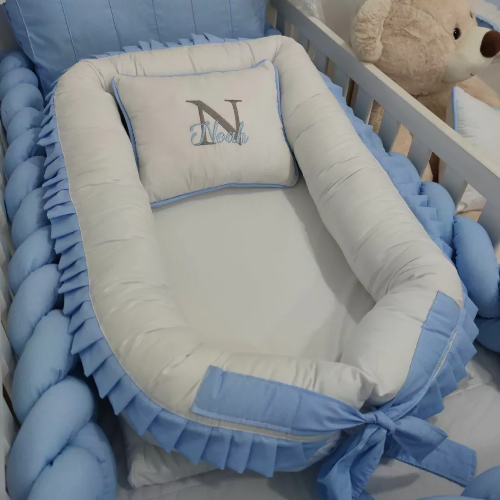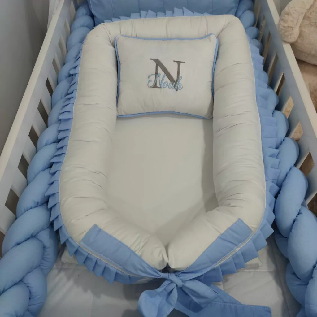 O Ninho Redutor Moisés para Bebê Menino Personalizado Azul Claro com Branco oferece delicadeza e aconchego ao seu neném. Nos primeiros meses de vida, o bebê pode não se sentir confortável em dormir no berço, por ser um espaço grande onde ele não está acostumado. Nesse momento, o ninho redutor pode ser seu maior aliado, trazendo conforto e qualidade ao seu pequeno, fazendo-o se sentir acolhido, como se estivesse no útero da mamãe. Podendo ser transportado para diversos lugares!