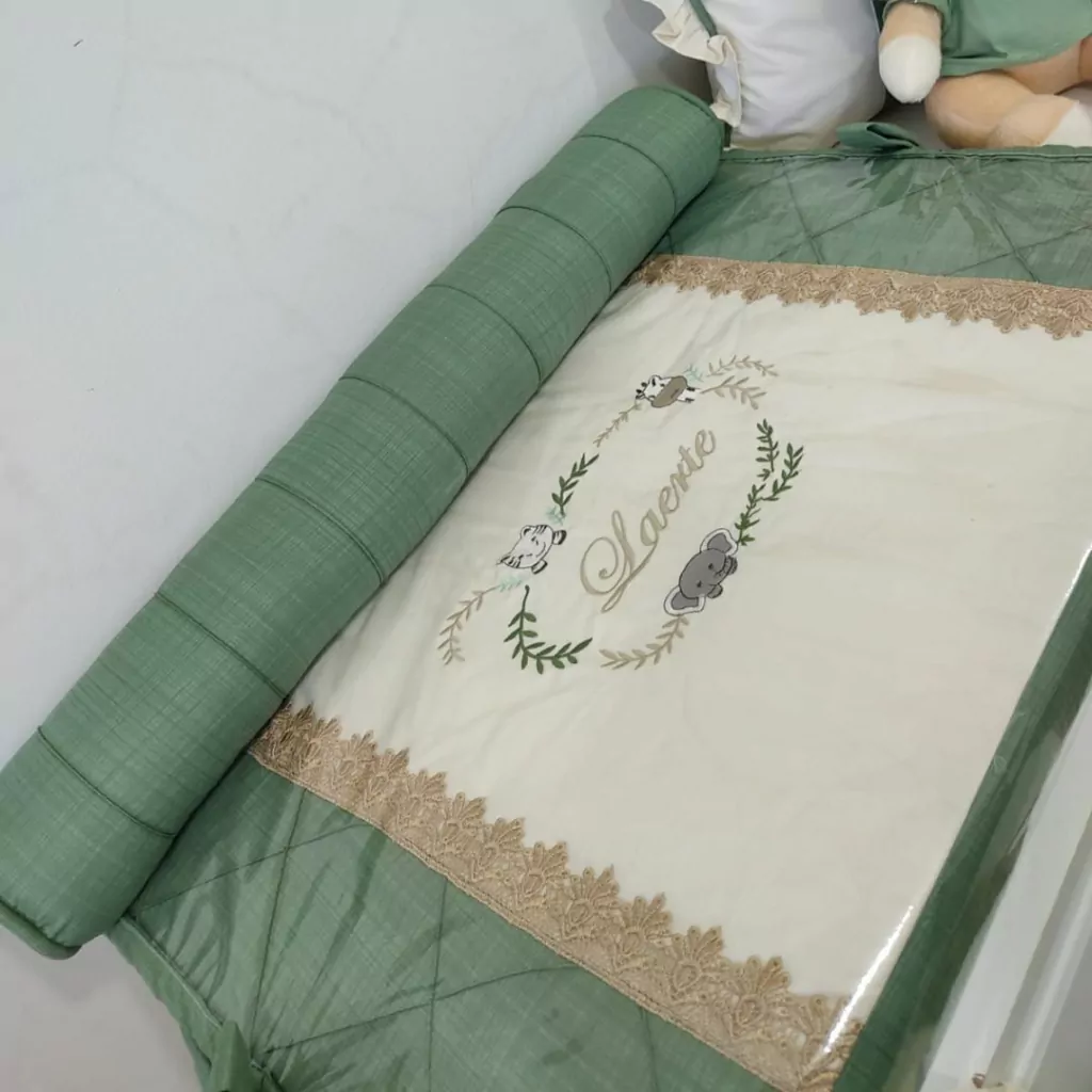 O Trocador de Cômoda Reto para Meninos Safari Selva Verde Folha com Rolinho de Apoio combina praticidade e segurança, tornando-o indispensável para cuidados com o bebê. Por ser impermeável, sua funcionalidade é eficiente contra líquidos, proporcionando uma experiência tranquila e essencial para os momentos de troca. Além disso, o trocador é bordado com o nome do bebê, possibilitando combinações encantadoras com outras peças desta mesma coleção.